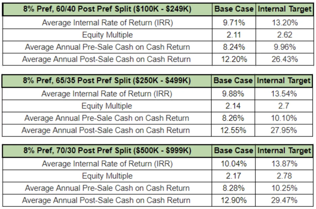 $50k - $249k: 8% preferred return, 60/40 post-pref split