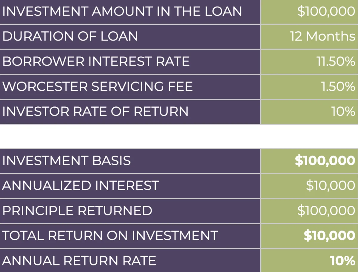 Worcester Financial is an asset based, hard money lender offering our investors an average return of 10% on their investment. Our loans are short term and generally do not exceed 18 months. The loan is collateralized by real estate or a physical asset.